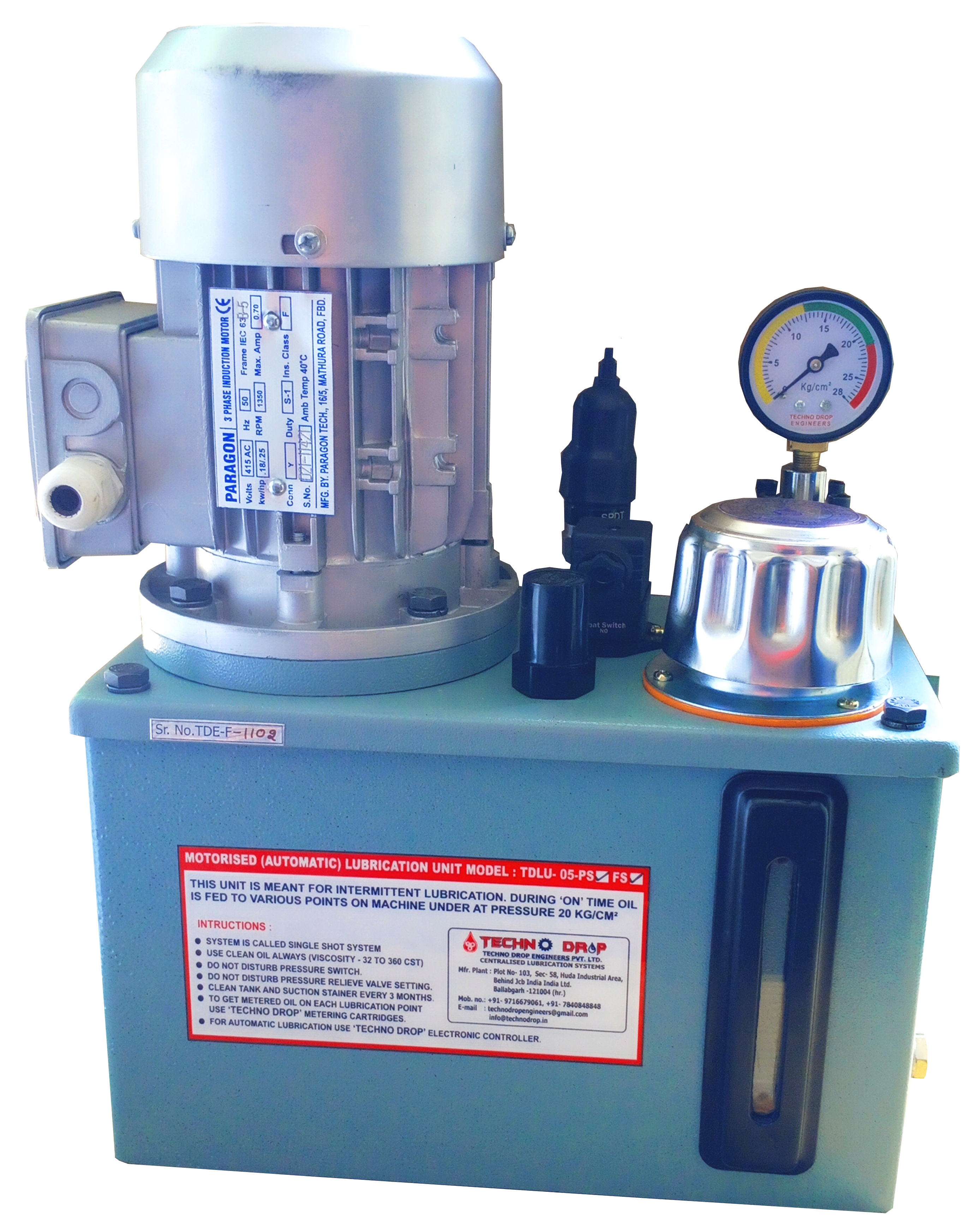 Techno Drop is Manufacturing and Supplying Motorized lubrication units. These motorized units are mini hydraulic power packs in which a rotary positive displacement pump that hold low discharge is driven by an electric motor along with reservoir, lubricant filler, suction strainer, pressure relief vavle, bleed valve etc. and are suitable for single shot automatic oil lubrication. Motorized lubrication units are available in single phase and Three phase.